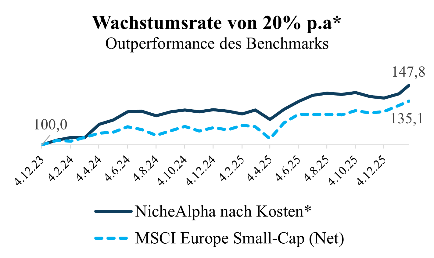 *In € und vor Steuern. Nach Verwaltungs-, Performance- und Handelskosten. Vergangene Wertentwicklung kein verlässlicher Indikator für zukünftige Ergebnisse. Auflage für Dritte am 4.12.23 (Index = 100). Stand 12.01.26